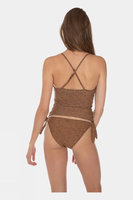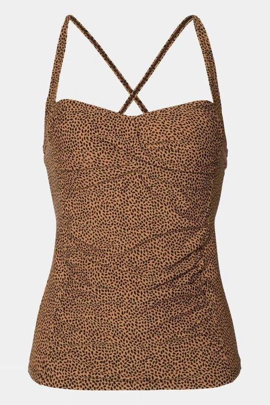 Meet the MM Femme 21 C cup tankini top by Protest. This great beach top provides coverage with a fun design. Printed with a fantastic all over design, the fabric of this top is gathered along the front panel and wraps across the chest. The fabric is also PFC-free in an effort to reduce the use of this chemical and thereby its harm to the environment. The straps cross at the back and can be adjusted to get the perfect fit. There are built-in foam cups and an underwire for added support. Have fun playing with your look in the MM Femme 21 C cup by Protest.